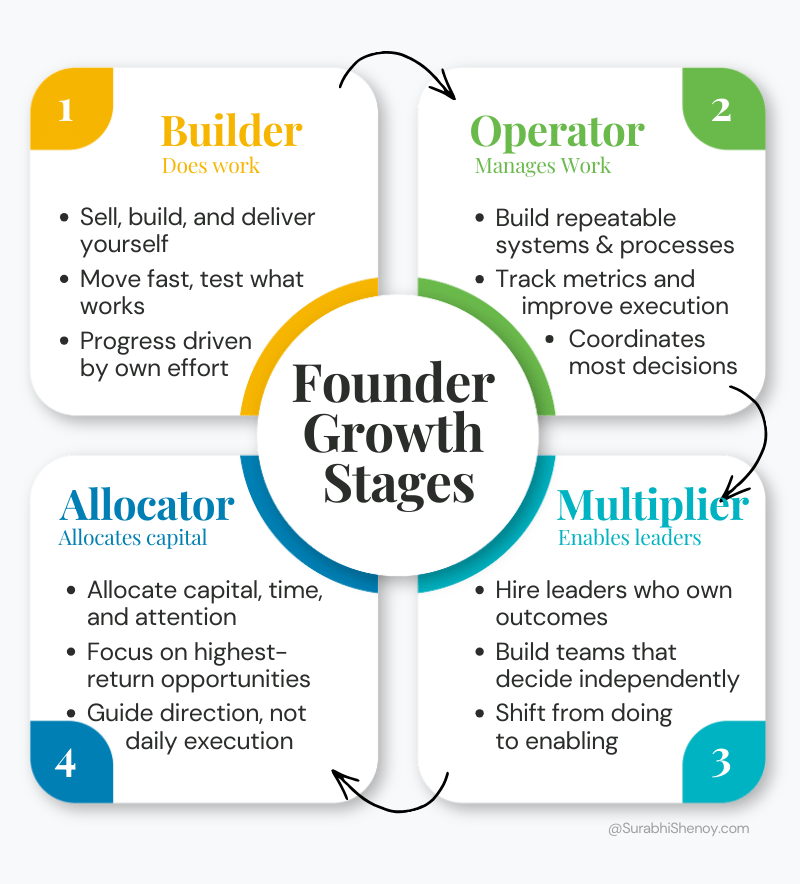 • Founders typically evolve through four stages: Builder, Operator, Multiplier, and Allocator. Each stage demands a different way of thinking and leading the business.